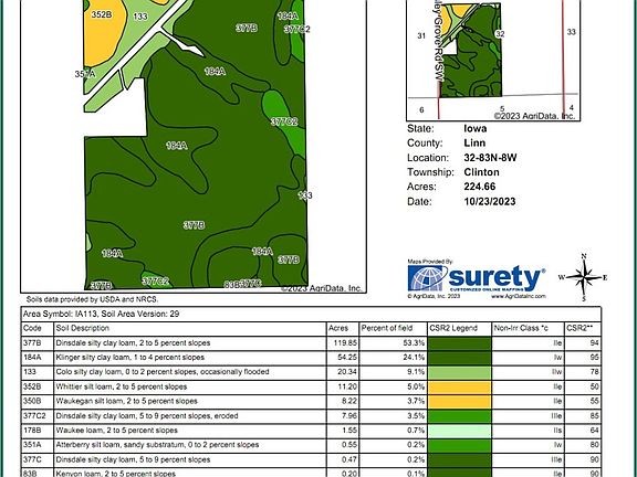 This is a highly productive 233.96-Acre, Linn County farm in an ideal location, just west of Cedar Rapids and a quarter-mile south of Hwy 30. While the overall average CSR2 is of the 224.66 cropland acres is 88.60, the 192.44 cropland acres southeast of the creek, average an exceptional 93.00 CSR2.