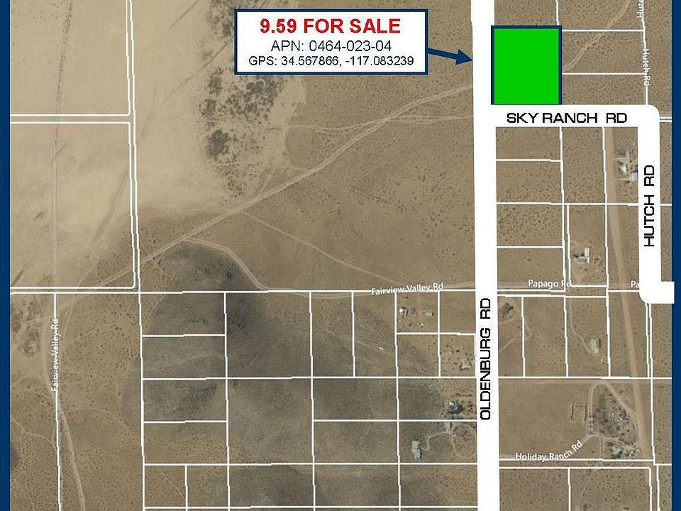 This 9.59 acre property is near the Town of Apple Valley within the San Bernardino County. This property is located 4 miles outside the city limits of Apple Valley in the Fairview Valley. The Town of Apple Valley was incorporated in 1988 and lies within the Victor Valley. The adjoining cities are Victorville on the west and Hesperia on the southwest. Apple Valley was home to Roy Rogers and Dale Evans and their influence can be seen on the street names such as Dale Evans Parkway and State Route 18 'Happy Trails Highway'. The Fairview Valley area, has homes on 2 or more acres, with some agriculture and farm style ranches. There is also a small dirt road airplane runway nearby. This property lies within the unincorporated area of the San Bernardino County within the 'Apple Valley Rural Living-20 Acre Minimum' zoning. According to the County this land use designation zoning district provides for rural residential uses, incidental agricultural uses and similar and compatible uses. Electricity is approx 0.25 miles south, this is a septic and propane area. The water would be provided by your own private well, keeping you out of the high costs of the water companies. GPS: 34.567866, -117.083239