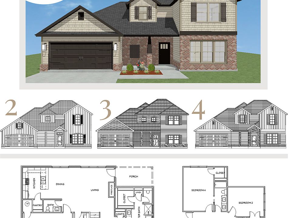 The Lily floor plan is a two-story home full of natural light. As you walk through the entryway, you are greeted by an open concept space that effortlessly connects the living room, dining area, and kitchen. The kitchen features a wrap-around island and walk-in pantry. The five large windows in the living space illuminate the home while providing a view to the backyard. Also on the first floor is the private owner's suite, featuring a private bathroom with a soaker tub, walk-in shower, linen closet, and double vanities, as well as a walk-in closet. Upstairs, you will find three guest bedrooms, the largest of which includes a vaulted ceiling for an added sense of space. Each bedroom has a sizeable walk-in closet and a shared full bath with double vanities.