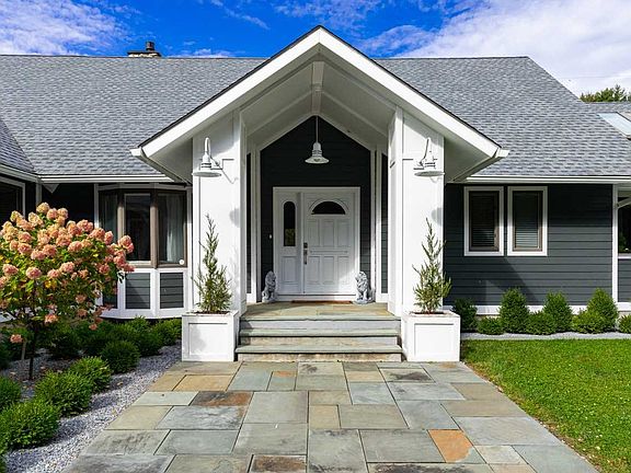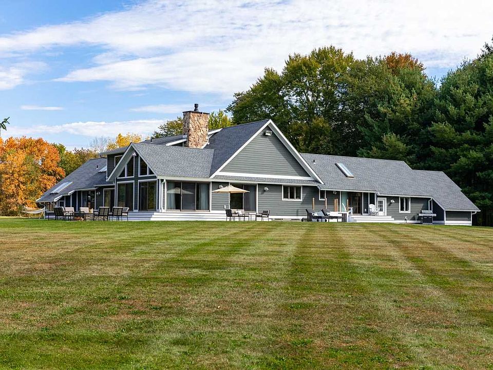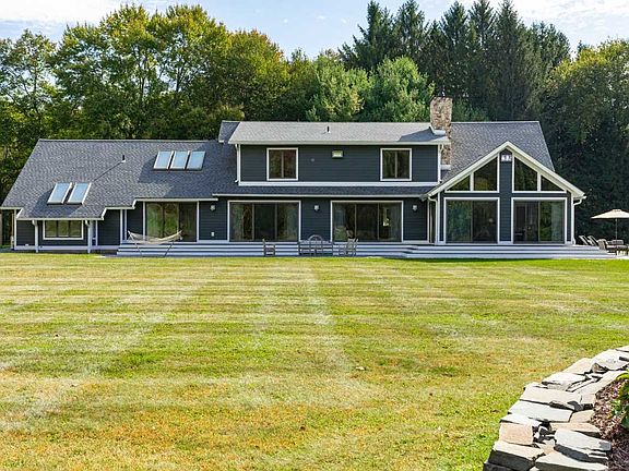 This contemporary oasis, thoroughly renovated in 2015, provides ease of living and luxurious spaces set deeply back among expansive sloping lawns and forest. Each room invites the season's color through the banks of glass doors and windows across the back of the house. Stairs sweep around the full back leading down to the blue stone and gravel terrace punctuated by an outdoor fire. The central public living area is perfect for entertaining with two sitting areas, a fireplace and dining area that open to the terrace outside. To one side is a chef's kitchen, sitting area, fireplace and adjoining sunroom. To the other, a first floor master bedroom suite bursts open to cathedral ceiling, skylights, large dressing room complete with a washer and dryer and bath featuring a sunken tub which looks out to the swimming pond and groomed lawn. An office with full bath is privately tucked away down a quiet hall linked to the garage. Upstairs are two bedrooms each with a full bath and walk in closet. The basement is completely finished with a huge recreational central room complete with a kitchen area, full bath, laundry room, workout room, office and five utility rooms. Come right in. It's ready for you to enjoy and rest.