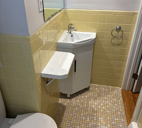 Also, larger renovated unit with stone counters, "shaker-style" white cabinets, and modern fully tiled oversized shower with glass door available now for $2,600.