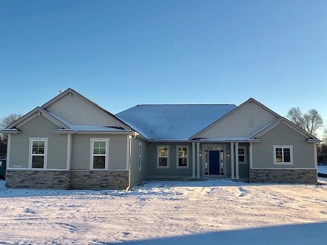This exquisite 4 bedroom open concept ranch home features soaring 12' ceilings in the great room with a stone gas fireplace, tray ceiling, and full wall of windows looking out onto the private 1-acre tree-lined yard! Kitchen has maple cabinetry with quartz countertops, island with seating, walk-in pantry and spacious dinette. The master suite wing of the house also features a tray ceiling, 2 master closets, and a spa-like bathroom with soaker tub, custom tile walk-in shower and separate vanities with quartz countertops. All 3 additional bedrooms are nicely sized with their own walk-in closets as well! Separate laundry and mud room finish this beautiful home! Easy to see and ready for move in!