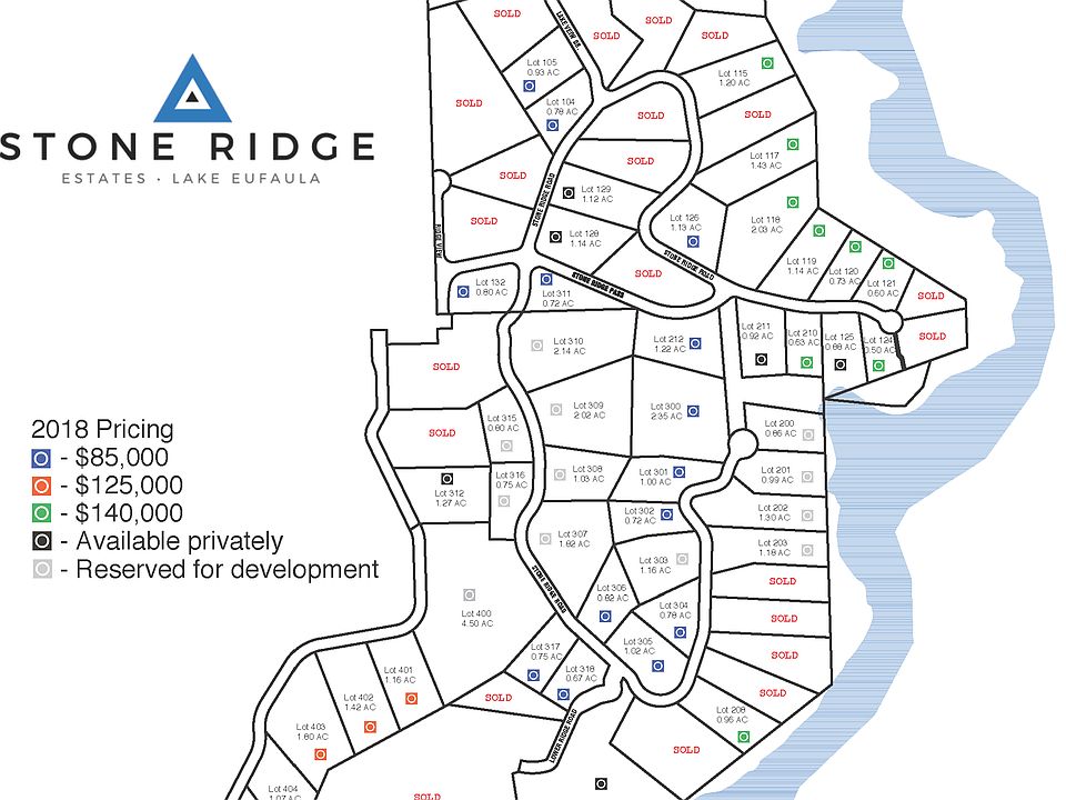 Stone Ridge Estates is located on Lake Eufaula... Oklahoma's LARGEST LAKE! 75+ sites to build custom lake residences. Scenic views and private community docks. Covenants & restrictions designed to protect the development & benefit the natural surroundings