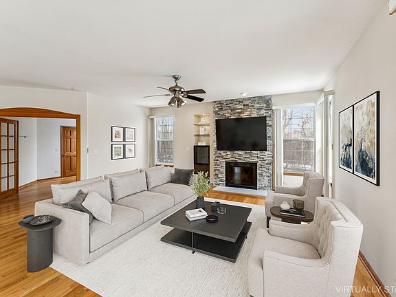 Beautiful home in a prime location tucked away on a quiet cul-de-sac! Step into a stunning two-story foyer with a dramatic double staircase. The huge, updated kitchen features 42" cabinets, stainless steel appliances, center island, granite countertops, and a glass tile backsplash, opening to a large eat-in area. Hardwood flooring flows throughout the family room, living room, and dining room. The family room offers a cozy wood-burning fireplace, while the first-floor bedroom with French doors can easily serve as an office. Enjoy 9 ft ceilings on both the first and second floors and solid wood six-panel doors throughout. The spacious primary suite boasts vaulted ceilings, double walk-in closets, and a luxurious bath with separate vanities, soaker tub, separate shower, and water closet. Hall bath includes a double vanity and extra linen storage. Convenient main-level laundry plus additional basement laundry. The full finished basement includes a full bath with Jacuzzi tub and separate shower-perfect for entertaining. Additional features include an intercom system, backyard irrigation, front yard power outlets, a large lot, and a rear deck ideal for gatherings. Don't miss this one!
