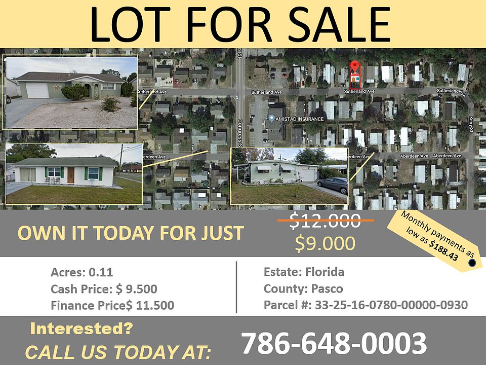 Great Lot in New Port Richey, Pasco County, 0.1 acre – Developed and very central location – Discount price +++++++++ PROPERTY SUMMARY 0.1 acre lot in New Port Richey, Pasco County. This property is 20% off. Utilities available. You can buy now and build later. Property located in a completely developed area, not many lots available around. Strategic Location although the lot is a infill lot near the beaches you will have near the countyside. Lots of supermarkets, restaurants, schools, Hospitals and shopping just a short drive way, in fact there is shopping just in the corner. You will have close beaches, Waterfront Park, Sunwest Park, Sims Park and New Port Richey recreation and Aquatic! No HOA. Buyer to verify and perform their own due diligence regarding the feasibility of their plans. Live near all you need with lots of amenities nearby, in a very central area. ++++++++++++ PROPERTY VALUE Market value of this property is about $12,000, based on properties sold in the area, there are not for sale now around so do not miss this chance. We offer this property with affordable cash price: $9.000, Financing available as just $188.43 per month, ask me if you would rather it! ++++++++++++ PROPERTY DETAILS: Size: 0.1 acres Topography: Flat Property Reference Number: APN: 33-25-16-0780-00000-0930 GPS: 28.268526, -82.706155 +++++++++++ PURCHASE OPTIONS We offer this property with two purchase options: 1. Cash Price: $9,000, you save $2,500! 20% off market value 2. Seller Financed Price: $11,000 with $2,800 down Then $188 per month for 60 months. This is a fully amortized loan financed at 12.9% with no credit check and no prepayment penalty. Lower interest rates are available with a higher down payment. Contact us for details. Additional $25 per month loan servicing fee added to monthly payment. $500 document / closing fee. +++++++++++++ READY TO BUY? We make the purchase process simple and easy. Just message us here to get started +++++++++++++ Disclaimer Buyer is responsible for verifying all information with the County as to what can and can't be done with the property. Buyer will need to work with the County to obtain the proper permits if needed. Buyer will also need to confirm the availability of any utilities needed or serviced on the property. Seller makes no warranties or representations about the land, its condition, or what can be built on the property. Phone or text us: 786 6480003