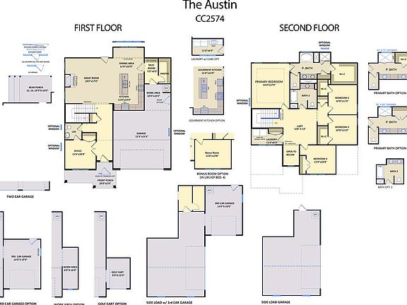 First floor home office with closet and optional additional window Open great room with optional fireplace and access to an optional covered porch and/or patio with multiple door optionsKitchen open to great room with island; open to the dining area with triple window option; gourmet appliance layout optionMudroom accessible from kitchen/dining area with walk-in pantry and optional built-in coat stationPrimary bedroom located on the second floor with optional additional window, spacious walk-in closet, dual sinks, and linen closet; 3 tub/shower layout options - Standard option with garden tub and separate shower with optional additional window - Option 1 with 36"x60" shower and linen closet - Option 2 with 42"x72" shower with bench seat and second walk-in closet Second floor with loft area at top of stairs overlooking the entryway, 3 additional bedrooms; full bathroom tub/shower combination and double vanity option - Bonus room option in lieu of 4th bedroomLaundry room on second floor with washer/dryer hookups and linen closet; optional laundry room layout with base cabinets and sink optionGarage with work station space. Multiple garage layout options available, including 2 and 3 car garages, with optional pedestrian doorFront door with optional transom window and sidelights