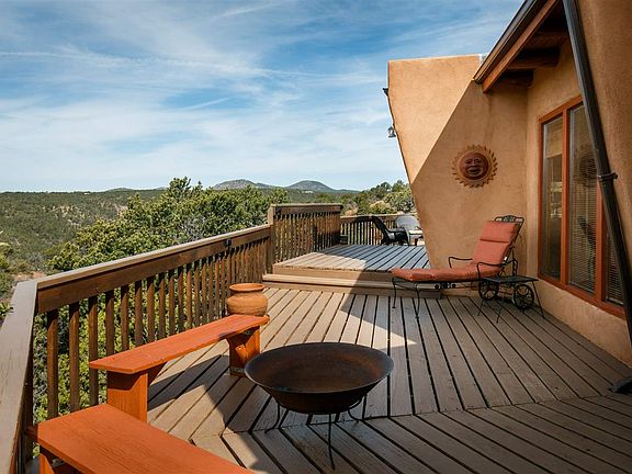 Mountain top home with breathtaking panoramic views bordering the National Forest abundant with wildlife. Pueblo style home features tile flooring, viga ceilings, corbels and nichos. Wood burning stove and kiva fireplace. Home office in loft, rest of home on main level. Landscaped entrance, multiple outdoor spaces. Horses are welcomed. New roof and stucco.