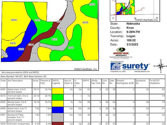 LAND AUCTION* *619.76 acres +/- (Offered in 6 Parcels at TWO Sale Locations!) Productive Cropland, Pasture, & Recreational Land 139.67 acres+/- Cedar County & 480 acres+/- Knox County *To Be Sold At Auction Thursday, March 30, 2023 *Cedar County Land Sells in Randolph, NE at 10am at the Randolph Community Golf Course Clubhouse (209 W. Wayne, Randolph, NE) *Knox County Land Sells in Creighton, NE at 3:00 p.m. at the Creighton Community Center and Inn (408 Rice St., Creighton, NE) *Online bidding available *Tract #4: 100 Acres +/-, subject to completion of survey *Legal Description of Tract #4: Part of SW 1/4 of Sec. 9-29N-7W, Knox Co., NE *Part of Parcel: #540007242 *2022 Tax: Approx. $3,500 *Description of Tract #4:This is a tract of quality cropland previously pivot irrigated but currently dryland farmed in recent years. The property offers good road access, productive Bazile, Trent, & Moody loam soils, and nearly level to gently rolling topography. There are 59.85 certified irrigated acres through the LNNRD and a small 80 gpm registered well #G-053993 that will transfer with the property. Call for more details regarding the irrigation history and water rights. This is another opportunity to expand your current farm operation or add to your farmland investment portfolio.