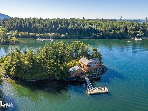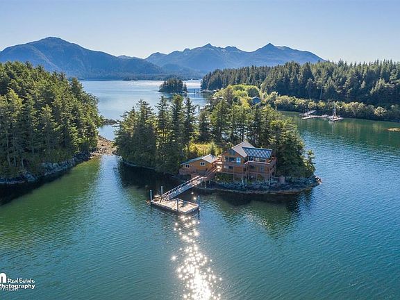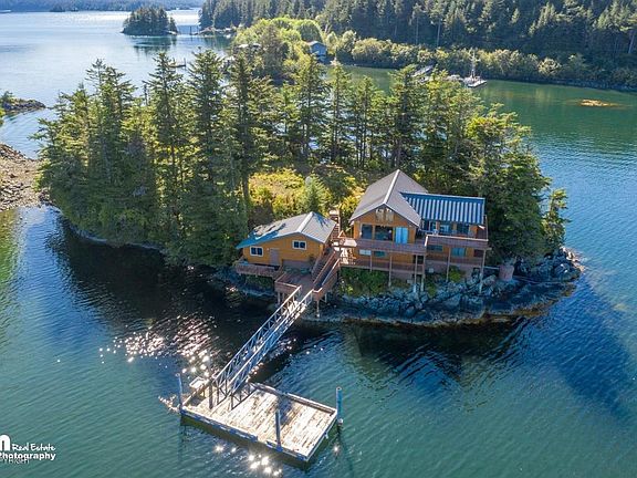 One of the finest island properties in SE Alaska with easy access to the town of Sitka. Home features breathtaking views and is ideal for entertaining guests. Modern-rustic decor with vaulted ceilings, panoramic windows & tasteful shiplap walls/ceilings. Expansive decks, city power, detached fish processing & gear storage, private dock. Seller Financing possible for qualified buyers.