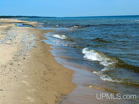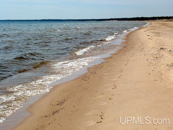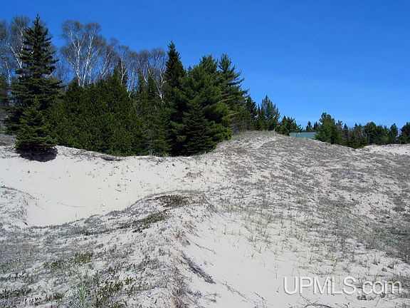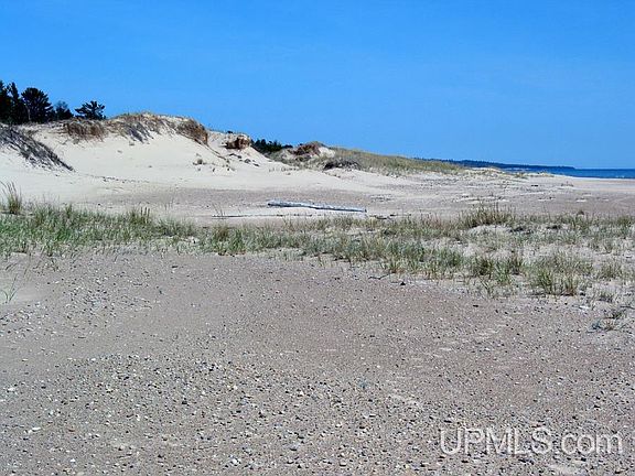 330' of deep sugar sand beach with rolling dunes and panoramic views! This 5 acre property offers plenty of privacy and abundant room to roam. Gulliver Creek winds through the east side of the property. DEQ Critical Dune permit for driveway and building site are transferable with proper paperwork.