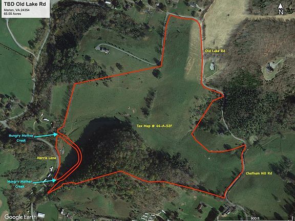 What a beautiful setting! This is a place of peace, quiet, and astounding views. Build your dream home on top of the mountain or along Old Lake Road. The property has Hungry Mother Creek running through it and some small streams that feed into the Creek. Currently a farmer raises cattle on the cleared portion, but those can be moved with notice. There is perimeter fencing that was put in place for the cows....very little cross fencing. Temporary corral in pictures belongs to the farmer. There are 3 field gates along Old Lake Rd and one along Harris Lane to access the property. There are public water and sewer lines that run along Harris Lane for possible connections. All mineral rights go with the land. Mark up of areial in documents.