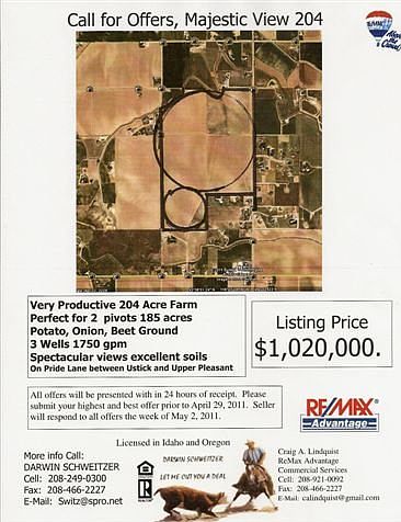 This is a very good farm with 3 operating irrigation wells that produce 1750 gpm. Agri-Lines Irrigation has a design plan for 2 pivots that will need 1460 gpm. Property is leased for the 2011 season. This property was purchased to be developed into executive lots with the best views in Canyon County.