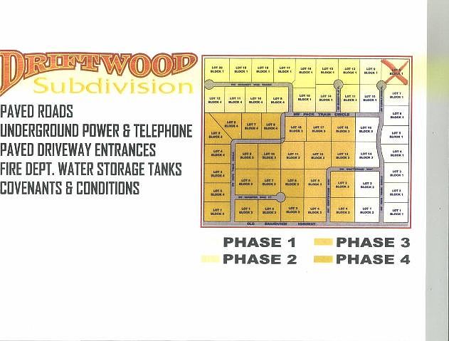 Fresh air, blue skies and wide open spaces await you in Mtn. Home's newest subdivision. All lots feature paved roads & driveway entries, underground utilities and a fire suppression tank in each phase. Bring your builders or use one of ours! Come home to country living at its best...come home to Driftwood.