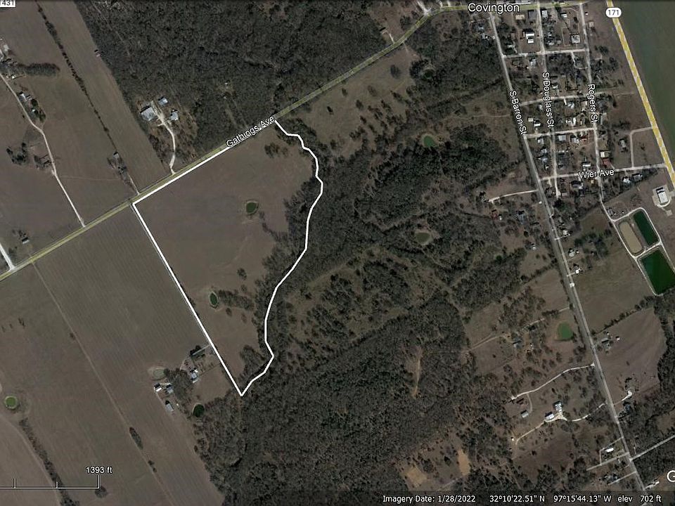 This 41.998 acre tract (recently surveyed) is located one quarter mile west of the town of Covington Texas on farm Road 67 (Gathings Avenue). A seasonal creek borders the property on the east and south side. The property is partially fenced and is presently being used as woodland and for the production of Coastal bermudagrass hay mixed with Bahia grass. There are two stock ponds on the property. The creek is lined with large trees and other native vegetation. A portion of the land is in the floodplain designation of ZONE-A. A portion of the land is also included in the corporate city limits of the town of Covington. The property has excellent access via Farm Road 67. There are several choice building sites.