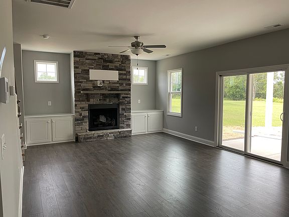Beautiful two-story home featuring a third garage! This plan offers an open living area perfect for entertaining. Features include 9-ft high ceilings on the main floor, a rugged stone fireplace straddled by custom built-ins, and an inviting kitchen with a walk-in pantry, center island, and hardwood soft-close drawers. Other highlights include covered back patio and front porch, a large flex room upstairs, and abundant storage.