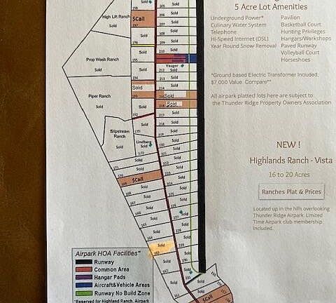Great 5 acre lot located on the Thunder Ridge Recreational Airpark for Fly In & Fly Out convenience. This a residential lot with room for your own Hanger. Water & Electricity are located at the street ready for hook up. Bring your plane, build a house & hanger for a wonderful getaway spot.