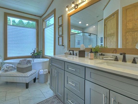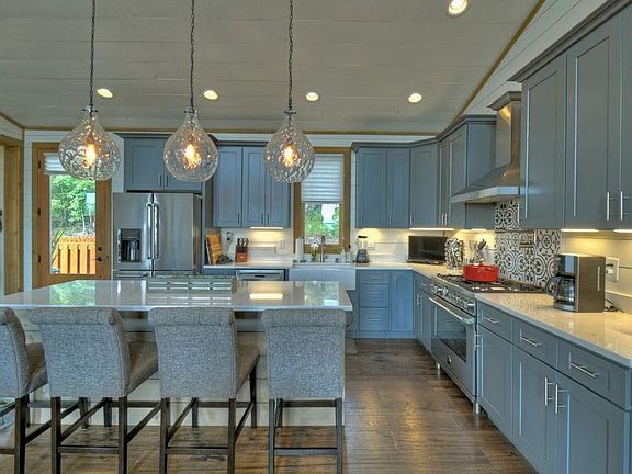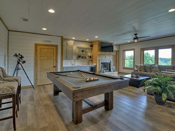 New Construction - 4BR, 4BA contemporary rustic inspired home offering open floor plan. Beautiful mtn. views nestled in some of the most beautiful mountains of N. GA. Soaring ceilings w/ lots of glass, 3 FP's including 2 inside and 1 outside, modern finishes, huge front "party porch" w/ wood burning FP, metal roof, Fin. basement w/ REC Rm/Den & wet bar w/ walkout daylight basement.