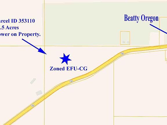 17.5 Acres with power on the property. Excellent HWY 140 ~ Grany Hoe Road Frontage. This beautiful parcel is about 1 minute west of Beatty Oregon.Mostly flat with some rolling hills. Several great homesites. Wells in the area are prolific and abundant. Situated minutes from Thousands of acres of public lands, enjoy your ATV, OHV, and equestrian pleasures.This is a perfect location for a family compound ~ campground ~ or meeting place.GPSLat. 42.4410Lon -121.2787