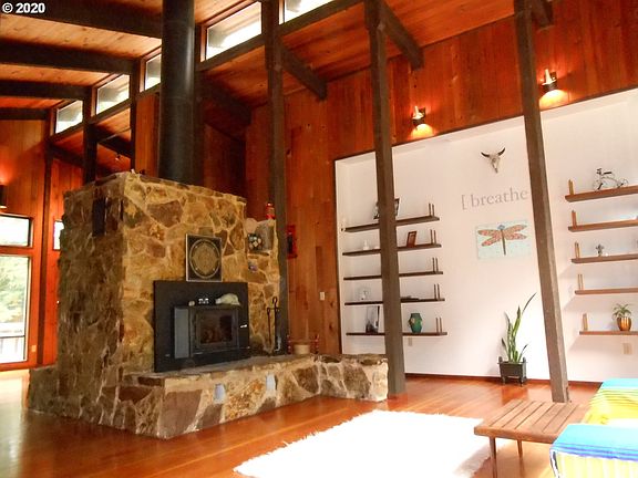 NW mid-century modern cedar home. Private end-of road location on wooded 5 acres. Timber-frame construction, vaulted ceilings, wood floors, full length windows, upper level transoms, stone fireplace w/insert. Updated kitchen, dining area. Living room, family room. Master bdrm w/bath, 2nd bdrm & bath, laundry. Attached carport w/storage. Charming guest cottage w/bath on its own septic. Art studio/workshop 1/2 bath, wood shed, walking trails. Hidden retreat in old growth forest not far from town.