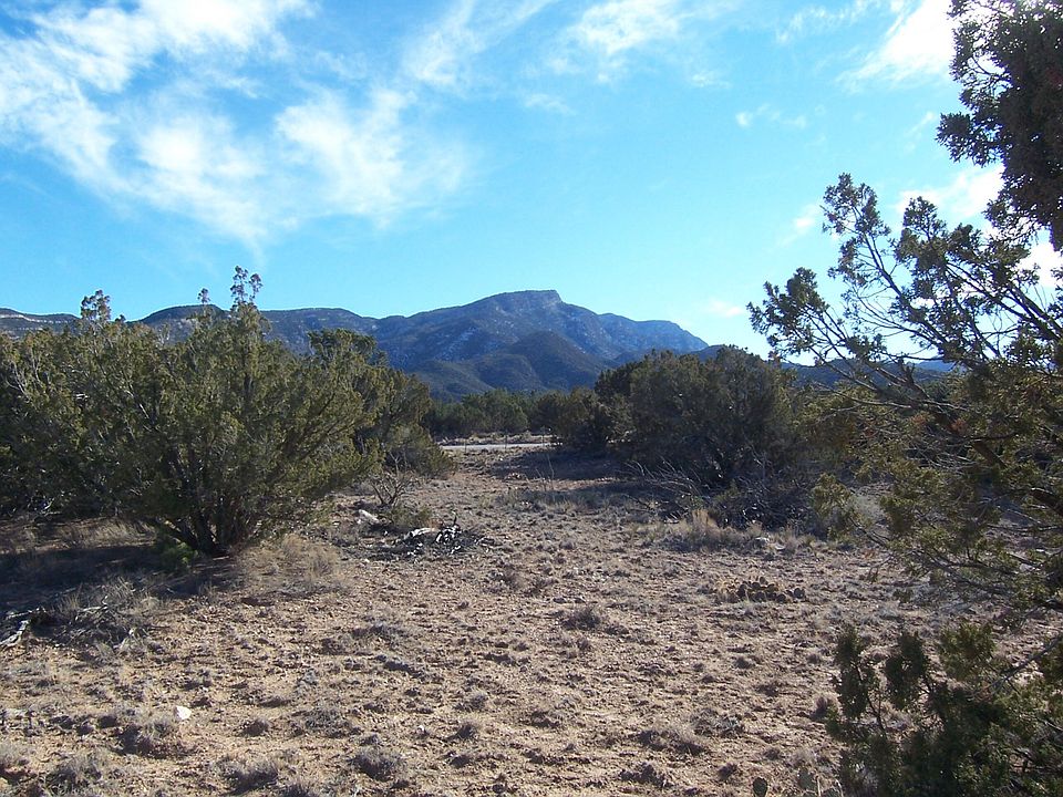 2.5 ACRES - NO RESTRICTIONS & BIG SANDIA VIEWS! $110,000. Convenient lot located to the south of Highway 165, close to National Forest! Spacious lot with plenty of trees and fantastic views to the south of the Sandia Mountains!!! No HOA and No restrictions! Minimal zoning includes 1008 sq ft minimum house size, 28 maximum height! Horses and other animals allowed! East part of the lot is nearly level land. Nearby wells are about 400 feet deep. Lot is located on the way to the National Forest, but less than 1/4 mile off Highway 165. Bank financing is available; owners will consider a short term Real Estate Contract with a reasonable down. The lot could easily be divided into 2 lots. The overhead lines along the north part of the land include electric, cable and phone. County maintained road.