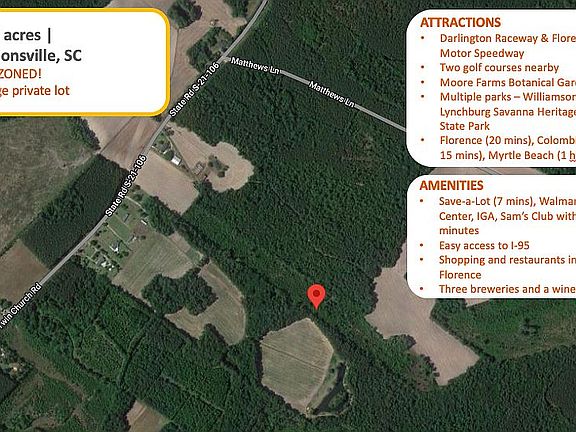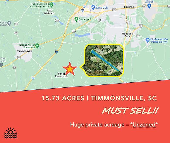 Priced to move! HUGE *UNZONED* 15.7 acre property in Timmonsville, SC. Enjoy the serenity and simplicity of country life with the amenities and conveniences of Florence right at your fingertips. With no restrictions, the possibilities are endless - homesteading, building your dream home, or constructing your own private compound! With this sprawling acreage, there’s plenty of room for all of your toys or animals. Or go ATVing or camping in your own backyard! The property is partially cleared and ready to build! Spend your weekends hiking, fishing, swimming, camping and horseback riding at Lee State Park. Hit the links at one of the two nearby golf courses. Stop and smell the roses at Moore Farms Botanical Gardens or relax with friends at one of the four breweries/wineries in the area. Perfect for car and racing enthusiasts - go drag racing at Florence Motor Speedway or cheer on your favorite NASCAR driver at Darlington Raceway. Looking for storage for your car collection? With no zoning restrictions, you can build your dream garage with no hassle. Market value is ~$55K based on recently sold properties in the area; SAVE BIG during our flash sale! IGA, Sam’s Club, Walmart within 20 minutes. Save-a-Lot is 7 mins away. Easy access to I-95. Florence is just 20 mins away - Colombia 1 hr 15 mins & Myrtle Beach 1 hr 45 mins. Water: public Sewer: requires septic Power: poles at street Zoning: UNZONED For more info, call/text us at: (980) 400-3117 or email: lorenzo@nextsummitinvest.com --------------- Disclaimer: Buyer is responsible for verifying all information with the County as to what can and can't be done with the property. Buyer will need to work with the County to obtain the proper permits if needed. Buyer will also need to confirm the availability of any utilities needed or serviced on the property. Seller makes no warranties or representations about the land, its condition, or what can be built on the property.