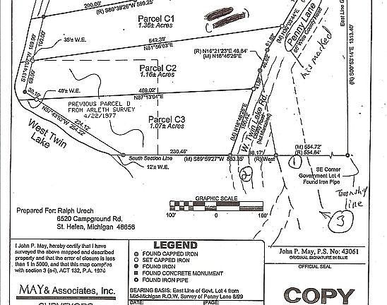 Lakefront vacant lot on West Twin Lake in St. Helen, Michigan near Houghton Lake, and West Branch. The secluded deep wooded lot is 1.36 acres total with 100 feet of sandy waterfront frontage on West Twin Lake, an approximately 500 acre very private all-sports lake with no public access located in St. Helen, Michigan Roscommon County, Richfield Township near Houghton Lake and West Branch. Please call me prior to walking the property so I can inform the neighbors as they keep an eye on the property for me. There is 150 feet of frontage at the road, Twin Lake Road ( maintained summer and winter by Roscommon County Road Commission) The lot is 599 feet deep on the north side and 542 feet deep on the south side. The attached survey map shows the property, Parcel C1, as 1.36 acres. This property has direct access off of Twin Lake Road for the whole 150 feet of frontage. An unobstructed Westerly water front view of the lake to watch the beautiful sunsets. The perfect setting for a possible walkout with 180-degree views of the lake. The deep wooded lake front lot is on the secluded Eastern end of West Twin Lake with closest cottages 100 yards away to the north and no cottages to the South. There are only 5 cottages at this end of the lake and only about 30 cottages on the entire lake! The ground has passed a Perk test and electrical power is already on site. Wildlife abounds with Ducks, Deer, Loons, Hawks and Bald Eagles. Fishing is excellent with trophy Large and Smallmouth Bass, Northern Pike, Perch, Sunfish, and Bluegill caught casting right off the sandy beach shore!! Direct access to 100,00 acres of State Land with DNR ORV and Snowmobile trails only half mile down the road, that you can now ride your ATV, UTV, Motorcycle or snowmobile to on side of the public roads!! The property is located in the lower right-hand corner of the aerial photo, courtesy of Aerial Graphics. The property is accessed directly off of Twin Lake Road, 300 feet before the beginning of the blacktopped portion that turns into Penny Lane, (which is the Richfield / Nester Township line). It is only an hour, 15 minutes’ drive from Bay City, 2 hours from Flint, and 2 ½ hours from Metro Detroit/Oakland County or Grand Rapids. Close proximity to the 2 largest inland lakes in Michigan, Houghton Lake is 12 miles west, and Higgins Lake is about 18 miles northwest, as well as Lake St. Helen 10 miles east. Drive 15 minutes and you will be in Houghton Lake and Prudenville, St. Helen or West Branch to make dining, recreation and shopping close and convenient for everyone. School district: Houghton Lake