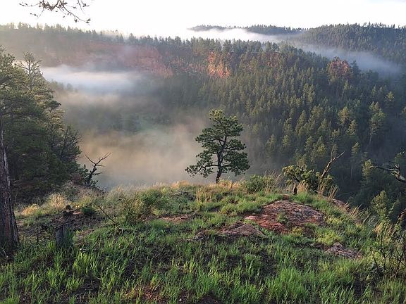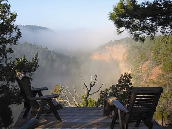 The cabin is a lodge-pole pine dwelling, in the tradition of an aged lodge. It offers full views of Red Canyon from three sides, rustic floors and cabinetry with state-of-the-art appliances, natural dry-stack, slate fireplace in the living room, and master bedroom, sleeping accommodations for 6 people. An outdoor hot tub that nearly floats above the canyon’s edge makes night bathing under the stars a life-time memory. There Are No Better Black Hills Views: On a clear day, Red Canyon offers extraordinary views to its east, where sheer red walls and jutting peaks accentuate the awesome powers that went into its creation, as well as the intricacies of its meandering path. To the west, the dense clustering of centuries-old Ponderosa pine easily explains how the area came to be known as the “Black” Hills, while a further gaze acknowledges, through beautiful open prairie, that Red Canyon does indeed have an end, and that Wyoming lies beyond.