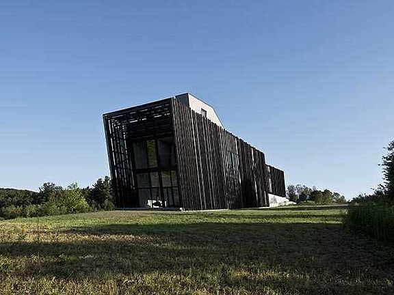 Here is a rare opportunity to own a unique home in the Hudson Valley. Located in the town of Taghkanic, it recently won second place (among 50 entries) in the American-Architects U.S. Building of the Year competition. This 3-BR/2.5-BA, 2,500 sf, all-season weekend home is sited on nearly 15 acres of open, rolling meadows, a setting that affords privacy, as well as dramatic valley and mountain views. As enigmatic as it is practical, the structure has intimate spaces for cooking, dining, and living, a tall, thin vertical slice for circulation, and a dramatic entry gallery. The sustainably-sourced Accoya wood skin, charred by a Japanese finishing technique called 'shou sugi ban,' gives the house's facade a rough, weathered texture, a contemporary reinterpretation of the exteriors of old barns in the Hudson Valley. Both ends of the home feature glass walls for maximal views of the surrounding countryside. The house has all of the accoutrements of a truly contemporary home, including a roof-top deck with water and electric service. 2 hrs. from NYC.