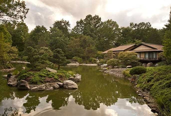 'Be One with Nature' - Tranquil, restorative, and private, this stunning 11 acre retreat in Rhinebeck, NY, embraces the aesthetic and landscape of an authentic Japanese house. Beautifully sited, the home is a viewing platform for the breathtaking traditional gardens, including waterfalls, walking bridges, a raked (Karesansui) dry entrance garden, stroll gardens, and a spring-fed koi pond with a turtle island. A natural paradise like no other. Built in the modern Sukiya-zukuri architectural style with Yukimi shojis and Tatami room. The 3 BR house was designed by a Kyoto architect, who worked on the restoration of Katsura Rikyu, using many Japanese master craftsmen. Every element of the meticulous construction was handpicked and custom-made, incorporating beautiful natural woods and materials, many imported from Japan. The beauty lies in its clean, uncluttered look, and the seamless relationship between house and garden. There's also a detached 2-car heated garage with a second floor for guest or caretaker quarters. A perfect masterpiece. Featured in Architectural Digest.