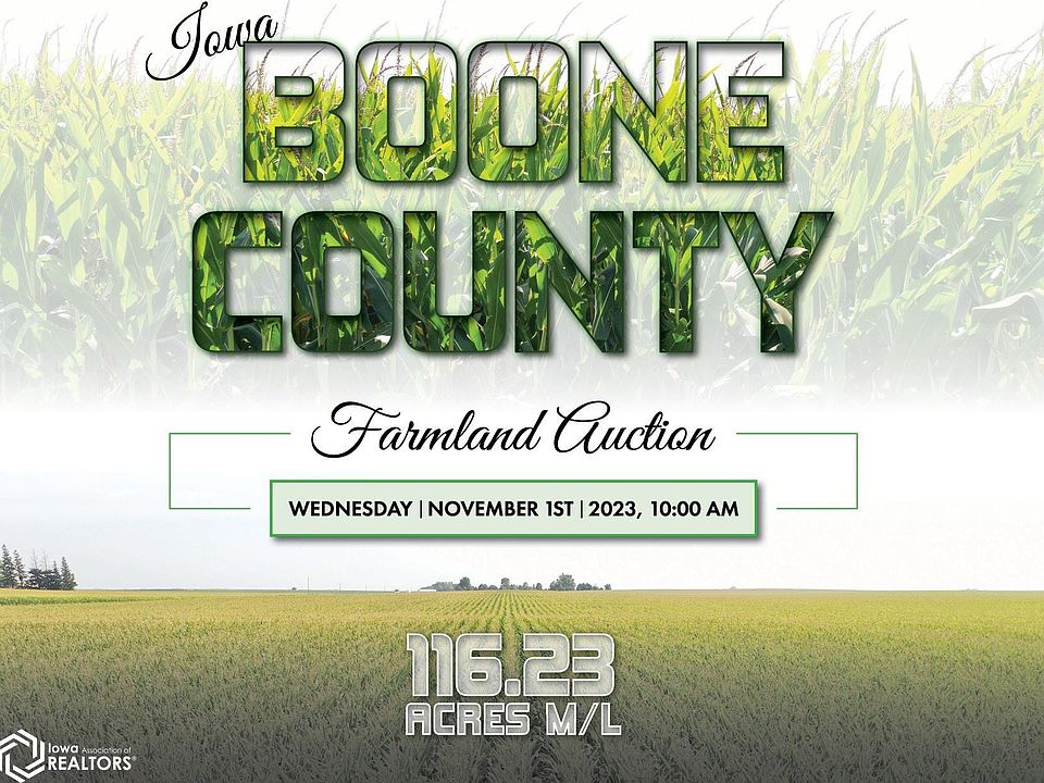 Boone County, Iowa Land Auction - Mark your calendar for Wednesday, November 1st, 2023 at 10:00 AM! Peoples Company is pleased to represent the Carolyn Ann Cottington Estate in the sale of 116.23 acres m/l of prime Boone County, Iowa farmland located just south of Ogden, Iowa, and adjacent to US Hwy 169. The 100% tillable farmland tract includes a total of 116.23 acres m/l with 116.79 FSA cropland acres m/l and a CSR2 soil rating of 83.9. This farmland tract contains top-producing soil types of Canisteo clay loam, Clarion loam, and Harps clay loam. The farm lease has been terminated and farming rights will be available for the 2024 cropping season. Agriculture is the primary industry in Boone County, Iowa and is home to some of the most fertile farmland in the world. As farmland becomes more of a scarce resource, the opportunity to purchase this farm allows you to own a piece of the Heartland. visit our website for more information regarding this Auction.