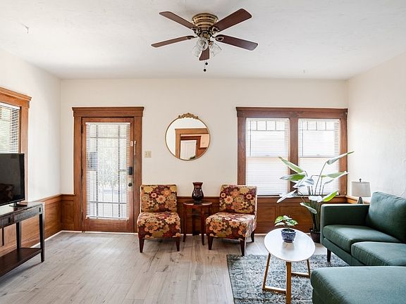 Old-World Charm: Beautifully preserved residence with rich redwood trim in living and dining areas Inviting Living Room