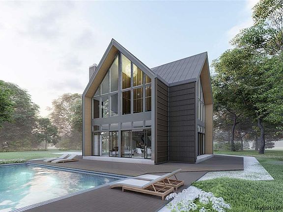 Meet Ciana, an artistic expression of the modern country home, offering open spaces, clean lines and soaring views of the Catskills. The first level is over twelve hundred square feet of entirely open space with 10'7" ceilings enclosed by European sliding doors on three sides. A glass central stringer staircase leads up to the second-floor corridor with glass inserts enchanting the light from the six-foot-wide glass star set into the gabled roof. During the spring and summer months, you'll be living outside indoors. During the autumn and winter months, find comfort beside our fireplace framed with views adorned in marble. Stay toasty with the minimalistic yet effective and efficient burnished concrete radiant heated floors. Entertain your-round while preparing a dish in the kitchen suitable for the food network, featuring marble countertops, prepping area, seating area intelligently concealed slow close storage for every use imaginable, recessed double door fridge and pantry finished in hardwood, vented hood and commercial grade appliances. Dine with a view overlooking the pool. Watch Netflix and chill in the media area. Guests can enjoy the half bath with solid surface vanity and a tech-minded toilet. Ample closet space for coat storage. The artfully designed steel and glass central stringer staircase leads you up to the second level with floors of glass. Containing three sleeping quarters with over 20' of ceiling height, this is where the tranquility happens. The floors will be sound-proofed to isolate the different uses. The south-facing master bedroom offers an open wardrobe plan, with custom hardwood closets, a sitting/dressing area and a highly detailed open full bath, all with vies of the Catskills through the super-efficient floor to ceiling windows. The second and third bedrooms are mirror images with full baths, space for king beds and generous closet space. Laundry room located in the central corridor for convenience.