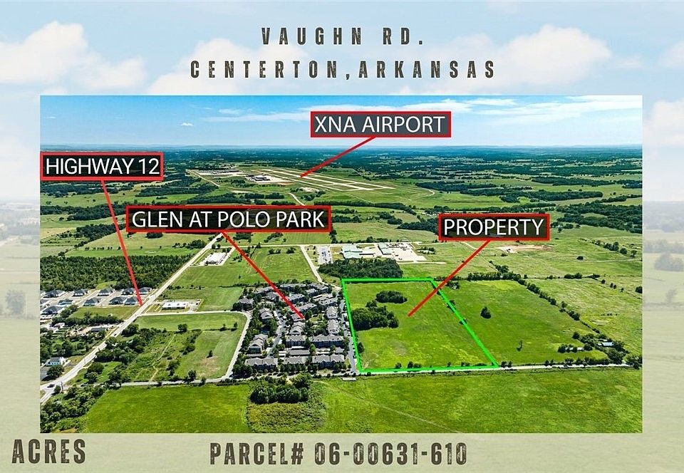 This 20-acre tract on Vaughn Road is positioned in Centerton’s fastest-growing corridor! Prime frontage with immediate access to SW Regional Airport Blvd, which carries over 11, 000 vehicles daily. Just 5 minutes to XNA and 15 to I-49. Zoned R-2, ideal for duplex or two-family residential development that serves as a transition between single-family and higher-density housing in one of the most in-demand markets in Northwest Arkansas. Water line at the street and sewer approximately 2, 100 feet west. Primarily open land with minimal trees allows efficient site planning. Surrounded by new residential communities, retail growth, and major infrastructure investment. This location offers the visibility, access, and momentum developers need to move quickly and maximize returns.