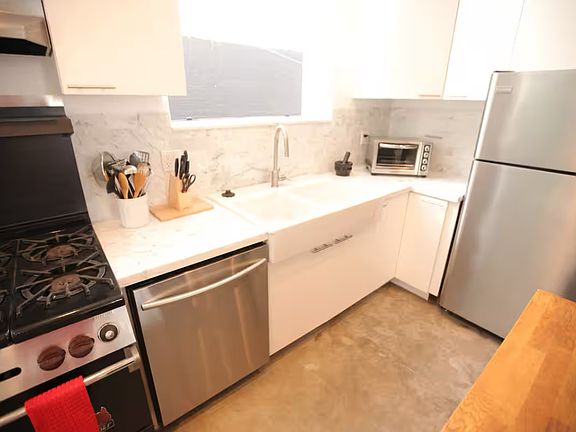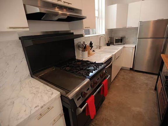 Beautiful, marble counters, wolf stove, stainless refrigerator and toaster oven, microwave, disposal, king bed, unique touches throughout, professional Emmy nominated production designer. Fully stocked, ready to move in.