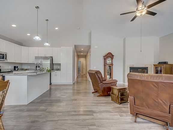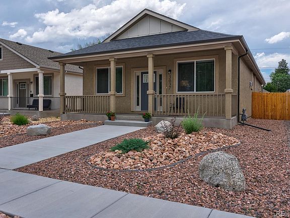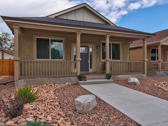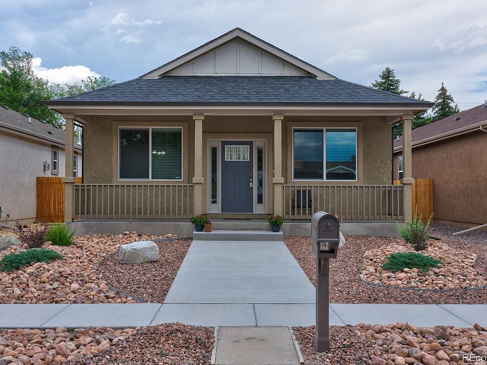 Charming stucco, ranch home. Like new, this home is move in ready. Enjoy front porch gazing at Pikes Peak. Close to so many amenities, 6 minute commute to UCCS. Inside, the great room concept showcases and open dining, kitchen and living room with vaulted ceilings. Living room features gas fireplace and spectacular mountain views. Kitchen has 42" cabinets, island with bar seating, granite counters and a neutral palette. Secondary bedrooms flank an extra wide hallway and share a full bathroom. Flooring is a weathered, wood-look laminate. Master bedroom has ensuite bath,dual vanities and an oversize shower. Separate, dedicated laundry room comes with mud sink and washer/dryer stay. Private patio nook is fenced and has enough room for your grill and a chair or two. One-car attached garage is accessed from alley as well as interior door near back of home. Make this your home!
