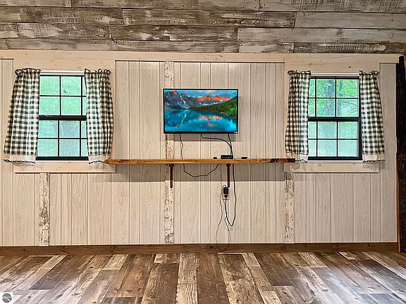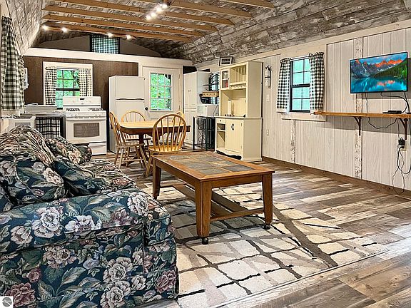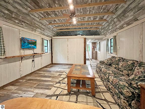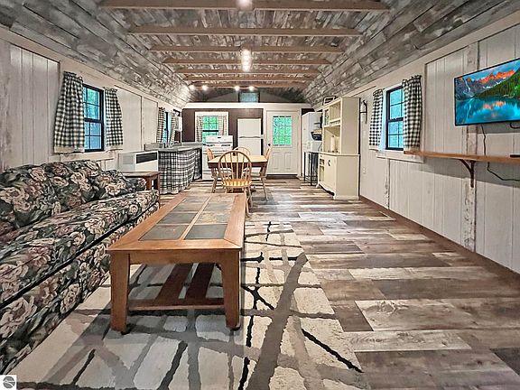 Escape to your own private retreat on 20 wooded acres of mostly hardwoods, including oak, maple, and beech trees. This secluded haven borders thousands of acres of state land and is a stone's throw away from the Long Lake motorcycle trail and the shore-to-shore horseback and hiking trail. Situated on this beautiful piece of land is a 14x40 cabin, featuring a bedroom, a loft for additional sleeping quarters, a covered porch, and a vented propane wall furnace to keep you warm. The interior boasts vinyl flooring and a ceiling finished in barn wood, providing a cozy and rustic atmosphere. Power is supplied by a generator hookup and a 12v solar panel system for lighting, ceiling fans, and phone charging, with a Generac generator included. Although the end table and coffee table are excluded, the cabin comes fully furnished, making it ready to enjoy. For the outdoor enthusiast, the property is prepared for hunting season with a gun blind and tree stand that will stay. Located only 20 minutes from Cadillac shopping and dining, and the additional recreation opportunities Lake Mitchell and Lake Cadillac offer. Make this your up-north retreat or a hunting base camp — the possibilities are endless!