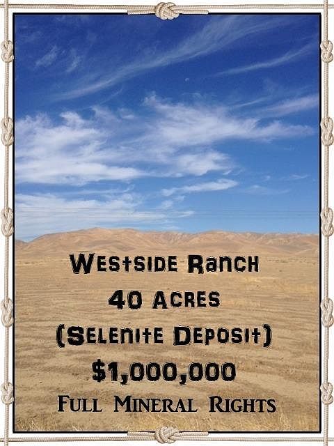 EXECUTIVE SUMMARY: Westside Ranch, 40 acres of farmland rich in Selenite crystals (gypsum) another revenue stream and within the Westlands Water District of western Fresno County. Neighboring farms currently cultivate almonds, pistachios and truck crops. Little Panoche Creek (riparian rights) runs through this parcel which allows for water diversion. So, install your irrigation system and commence farming. Our world's population hungers for quality food and as Dr. Norman Borlaug said: Food is the moral right of all who are born into this world while its moral wrong is famine. And note, sale includes the transfer of parcel's oil, gas and mineral rights too.