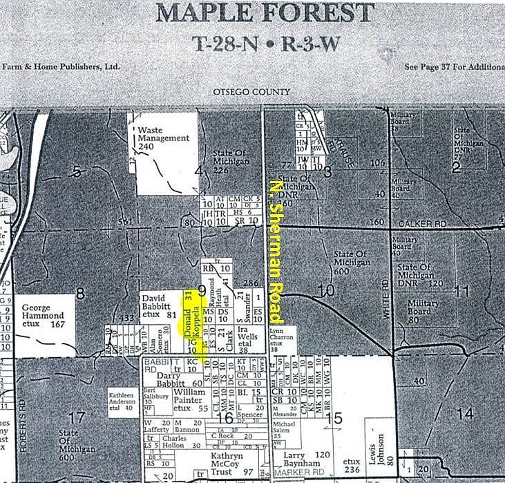 UP-NORTH DREAM... 30 acres. Located minutes form the I-75 Waters exit. The front 10 is cleared, the back 20 is heavily wooded. Adjacent to many acres of STATE LAND. Property is accessed by easement just off from Babbit Rd. Great price...just $28,000.