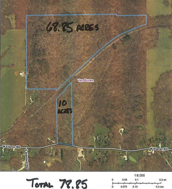 78.85 acres of wooded bliss on Bloomington's west side. Perfect for building your dream home, dividing into lots, or used as your ideal hunting and recreational getaway. Not far outside of town on 45 this is close to CRANE, west side amenities and shopping, and the Monroe County Saddle Club. Perfect for deer hunting, ATVs, horseback riding, or hiking the wonders of Mother Nature. Heavily wooded this property will have a return on investment with a timber harvest in about 15 years. Deer and wild turkey abound. This property has road frontage on Elwren Road and there is an old abandoned rail road line that dissects the property which makes travel and access throughout a breeze. Rare big acreage for Bloomington and priced extremely well. An additional 65.51 acres with custom home and studio is available for purchase. In total 144.36 acres is available with different configurations and pricing.