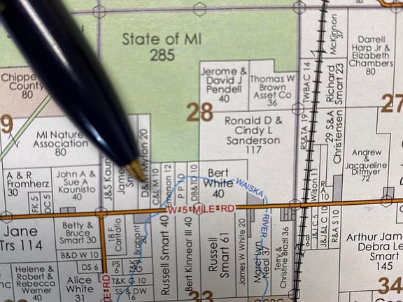 20 wooded acres just SW of the Sault on west 5 mile road. Nice building site in front. Property adjoins 1328 ft of State of Michigan both to the East as well as the North. Build, hunt enjoy the outdoors. Electric at paved county road.