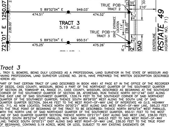Tracts 3 of a newly subdivided parcel featuring an approximate 5.18 Acre Lot just off of the frontage road between 7 Hwy and 307 in the outskirts of Harrisonville. Great opportunity to build a property to suit your own needs and desires while maintaining quick and easy access for a great commute. Buy one tract by itself or adjust the size of your property by purchasing multiple tracts. **Buyer and/or buyers agent to confirm all details related to zoning, size, lot lines, school districts, etc...**