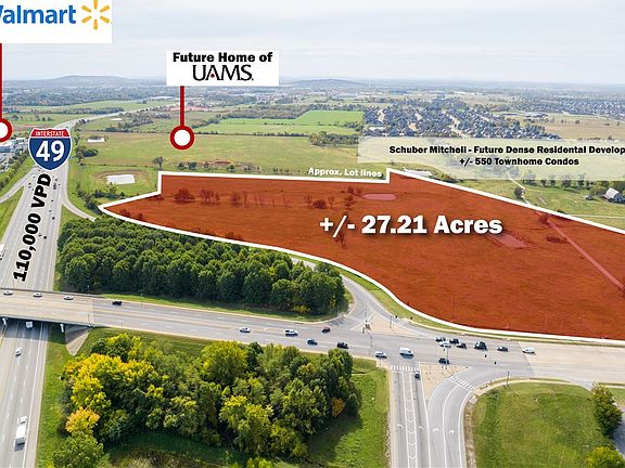 water, sewer, and gas available at the street and electric available on site. The current site plan is preliminary; shape, size, and access are subject to change and can be tailored to suit the end user. Surrounded by top national retailers such as Walmart, Starbucks, Chick-fil-A, McDonald's, Academy, and Ross, the property is ideally positioned for high-traffic commercial use. Ideal spot for retail, big box, grocery, and more. Located just 2.5 miles from Top Golf and Walmart AMP, 10 minutes from the new Walmart World HQ, and less than 20 minutes to XNA. Additionally, University of Arkansas for Medical Sciences (UAMS) is building a new facility directly next to this site, and Schuber Mitchell Homes is set to develop +/- 520 housing units - fueling growth and foot traffic to this dynamic location.