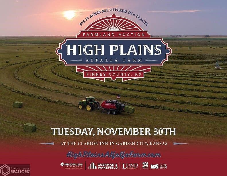The High Plains alfalfa farm totaling 975.15 Acres m/l is located near Garden City, Kansas in Finney County. The farm will be offered in 4 tracts ranging from 135.02 acres m/l to 319.25 acres m/l via the multi-parcel auction formation where tracts can be purchased individually or in any combination. The farm is comprised of approximately 778.57 FSA cropland acres m/l with 17.64 acres m/l enrolled in the CRP through 2022 with an annual payment totaling $680. This farm is authorized to irrigate 938 acres m/l through 7 well maintained Valley pivots with the entire farm currently planted to high-quality alfalfa with establishment dates between the fall of 2016 and 2021. Utilizing high-quality alfalfa varieties, local cattle manure, and extensive management practices, this farm has consistently produced alfalfa yields well above county averages. Buyer will be responsible for a Buyer's Premium of three percent (3%) of the purchase price, such amount to be payable at closing.