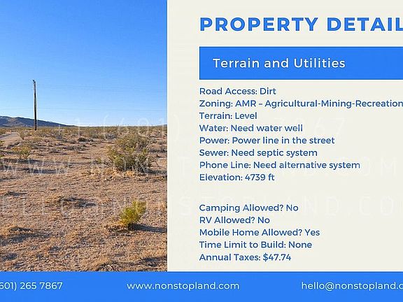 2.5 acres in Ridgecrest in Beautiful Kern County, CA! **************************** Contact Varghese to learn more: 601-265-7867 - sales@nonstopland.com **************************** If you need a break from the daily grind of your Monday through Friday life, then come out to Ridgecrest and enjoy your weekends on a fantastic, gently sloping 2.5 acre property. This small town has Museums (which are free for locals), Parks, and other family fun. Spend the morning at Kern County Parks & Recreation and relax and recoup from a stressful week. There is great road access, and power and water right on the street, so getting a weekend place built will be a snap. If you decide to live out here full time, you are only 9 minutes from town, so it’s very convenient! Take a relaxing stroll and enjoy plenty of peace and quiet. Whether you choose our discounted cash price or our owner financing, you will be buying for much less than retail. Talk about a great financial decision! This can be your home today! Contact us immediately so we can make that happen!! **************************** The parcel sits on West Springer Ave Ridgecrest. Use these coordinates to find the property via Google maps: 35.59383, -117.70861 or Right off US-395 highway, turn to S. China Lake Blvd, turn left to S Mahan St., and then left turn to Springer Avenue straight ahead, property is 2 parcels away from Brady st + Springer ave intersection on the right side. On this property you can build a Single-family stick built, Mobile home, Camping and RV. Electrical Post within the area and the buyer will have to set up a private well & septic system. **************************** Buyer must verify & work with the County to know what can & can't be done with the land, obtain proper permits if needed & confirm the availability of any utilities needed/serviced on the lots. Seller makes no warranties or representations about the land, its condition, or what can be built on the parcel. **************************** Purchasing property from us is quick & effortless. This property will be closed by a local title company & is guaranteed to be free of all liens and encumbrances. Buyer will receive title insurance & warranty deed. Message us here/call us today to get started. **************************** You can purchase this land with cash for $15,997, other payment options available. **************************** Property Details: Lot Type: Land Sale Price: $15,997 APN (Assessor’s Parcel Number): 508-120-23 Acreage: 2.5 Acres State: CA County: Kern County City: Ridgecrest Street: West Springer Ave Type of Road: Flatted Dirt Road Zoning: E(2 1/2) RS MH Terrain: Leveled Elevation: 4739 ft HOA/POA: No Mobile Home Allowed? Yes Time Limit to Build: Depending on Building Permit Annual Taxes: $47.74 **************************** To buy this lot at this discounted price call/txt/email Varghese @ 601-265-7867, sales@nonstopland.com . Don't miss out on this great deal call/text us now! Note: We also may have other property at bargain prices just like this one available - ask us when you call!