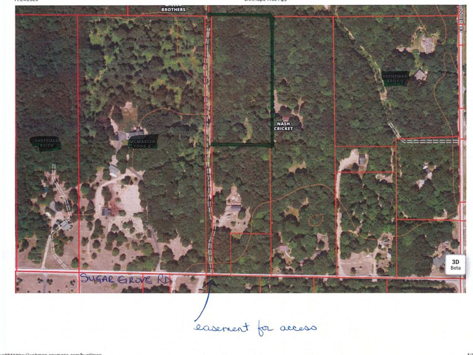 Well wooded parcel with mature trees, accessed by an easement that runs north off of Sugar Grove Road, and along the west side of the property, which is 660 feet along the easement. There is a driveway at the south side of the property that accesses the home to the east, and will be an easement across this parcel for access. Approximate south line is marked with pink ribbons. Approximate location of all 4 corners and north line was marked by the seller. Seller will survey the property prior to closing.