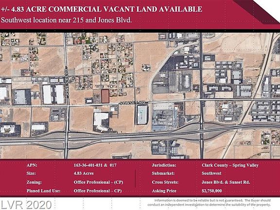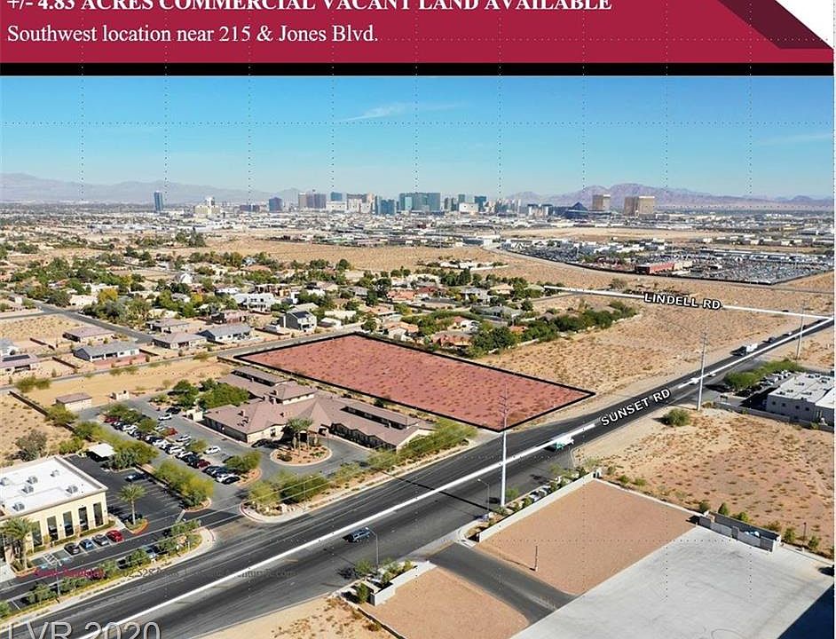 5 gross acres fronting Sunset Rd. Development is active, with very few Office Professional lots available in the area. Close access to the 215 and an estimated 9,000 Cars per day along Sunset Rd.