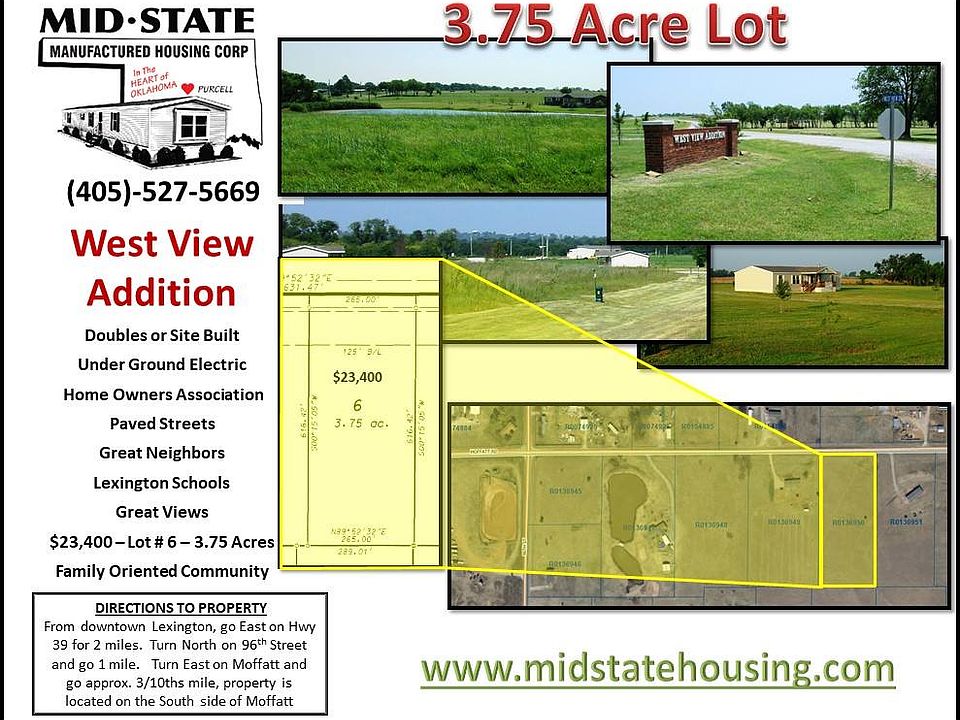 Last tract in the "West View Addition", Lexington, OK. A Beautiful 3.75 Acres in an area with excellent neighbors and great people! This spot is ready for your dream home in the country! Lexington and neighboring Purcell offer a quiet country life style with great shopping, Schools, restaurants and Purcell lake with a golf course, swimming, biking, jogging, fishing and much more!!! A great place to raise your kids or retire! Best part is only a hop, skip and jump from I-35 for an easy commute to Norman or OKC... The best of everything for your family! Call me today! Becky- 405-434-1170