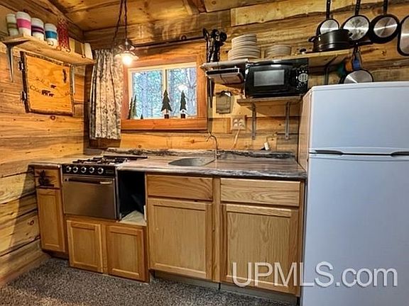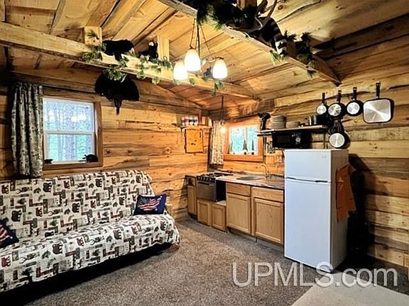 Secluded setting for this "up north" retreat! Clean, well maintained one room cabin on 4.86 wooded acres. A must see inside! Insulated with wormwood pine interior, plenty of cabinets, cast iron boxwood stove, and 100 amp electric with camper hook-up. As an added bonus, it's sold mostly furnished! The deck overlooks the tall pines and firepit area. Screened gazebo. Two sheds. And in a great rec. area with ATV trail access and it's just down the road from public County Land