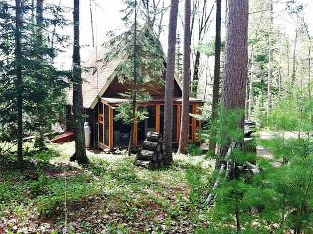 HILTS LAKE HOME- SIMPLY ESCAPE! Been longing for waterfront property but not the close neighbors? Here's a secluded rustic retreat w/just enough amenities to provide for comfort. Peace & quiet on beautiful 60' deep 59-acre Hilts Lake in the Harrison Hills area. Panfish & LM Bass are abundant w/muskie present as well. Electric & phone to the property. The main level has bathroom (composting toilet, shower, stool & sink), kitchen w/appliances included, living/dining area & two screen porches, one at the entry & the other large one lakeside w/a special pet door & ramp too. Spiral stairs to the loft bedroom w/two sleeping areas. Lower level accessed through the exterior Bilco doors or trap door in kitchen. There is a permanent road easement that crosses through county land to access property. Two soil borings in past show mottling with sand below. Need 3rd boring for conventional system. Fishing, wildlife and Loons! If you yearn for waterfront privacy, you MUST see this property!