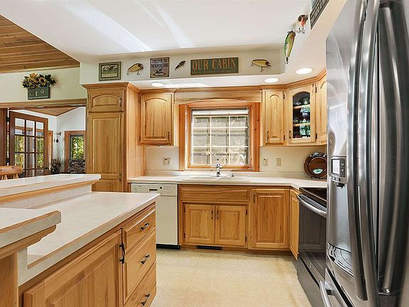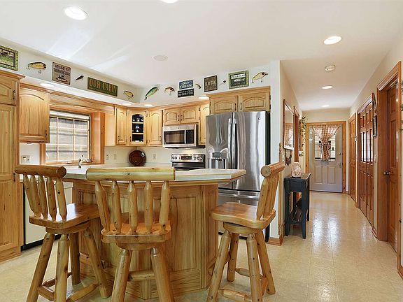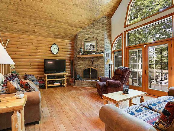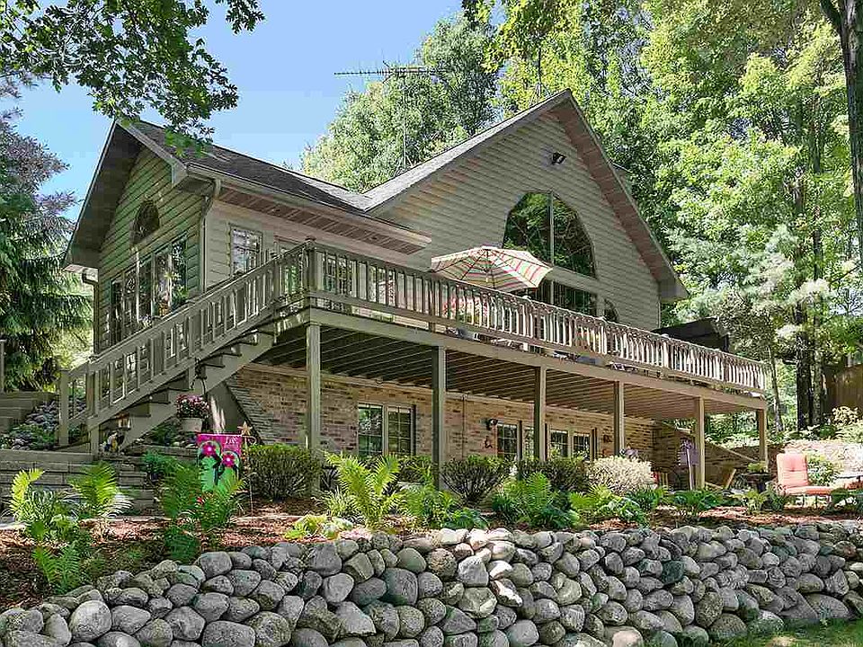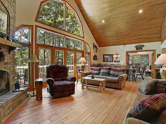 Stunning waterfront lake house on Legend Lake with brick paver path leading to a private beach & boat launch. This home boasts a beautiful open concept great room with brick fireplace, hardwood floors, vaulted ceiling, & floor to ceiling windows overlooking the lake. Other features include Pella windows & doors, 6 inch thick walls, upper level lofted bedroom, master bath with tub & walk-in tile shower, central vac, & walk-out access to the deck from the great room and adjacent 4 season room. Walk-out LL with huge family room, wet bar, fireplace, full bathroom, & additional bedroom.